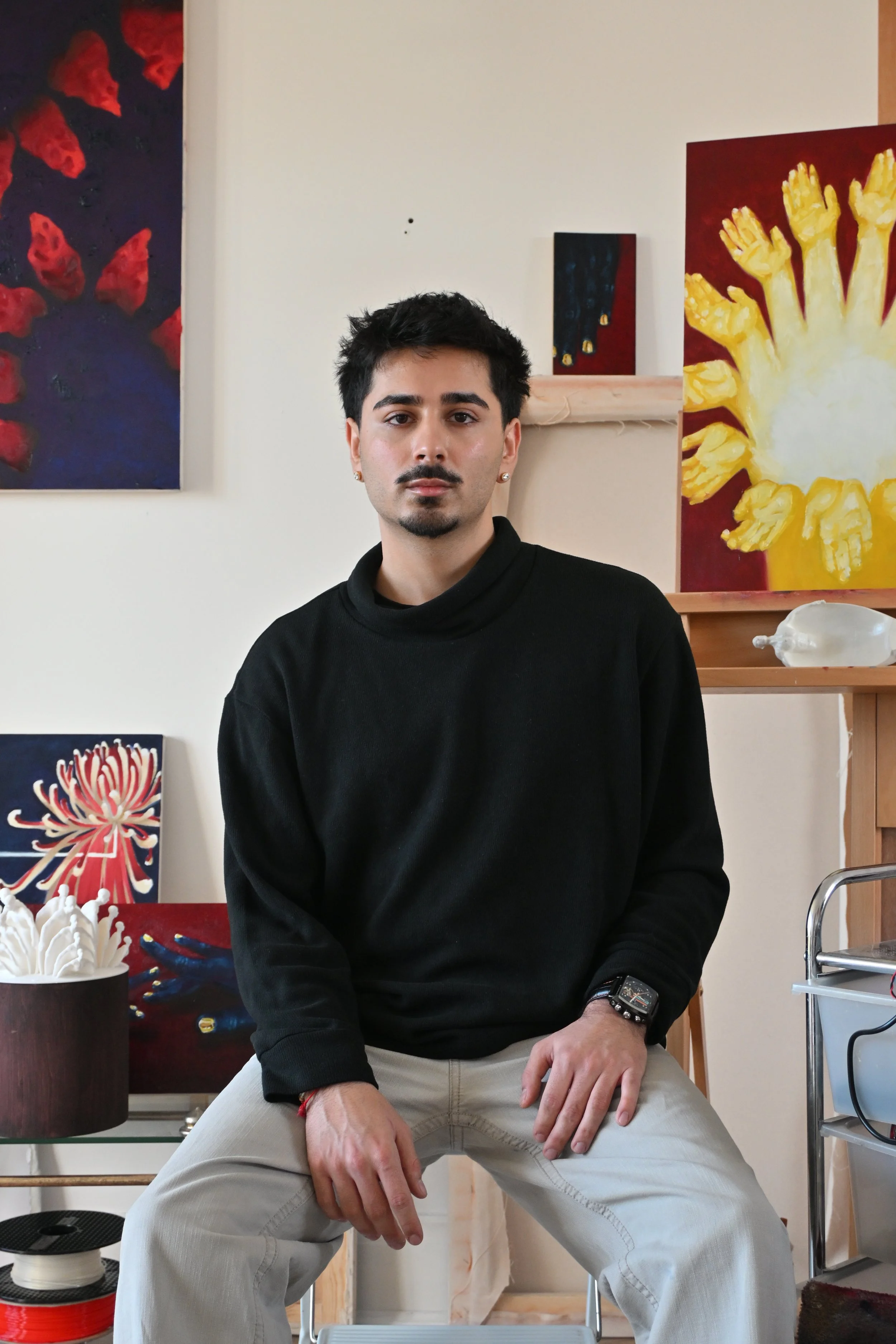 Working primarily through sculptural and painted forms, Bhundia often renders the body as contorted, partial or hybridised. Organic and floral motifs intersect with digital processes and mechanical structures, producing works where the biological and the technological coexist in tension. These material investigations reflect a broader interest in how bodies are shaped by systems of movement and exchange. Alongside his studio practice, Bhundia develops collaborative platforms through curatorial and editorial work, most notably as Editor-in-Chief of Translocation Magazine, an annual publication that foregrounds active trans-cultural artistic practices.