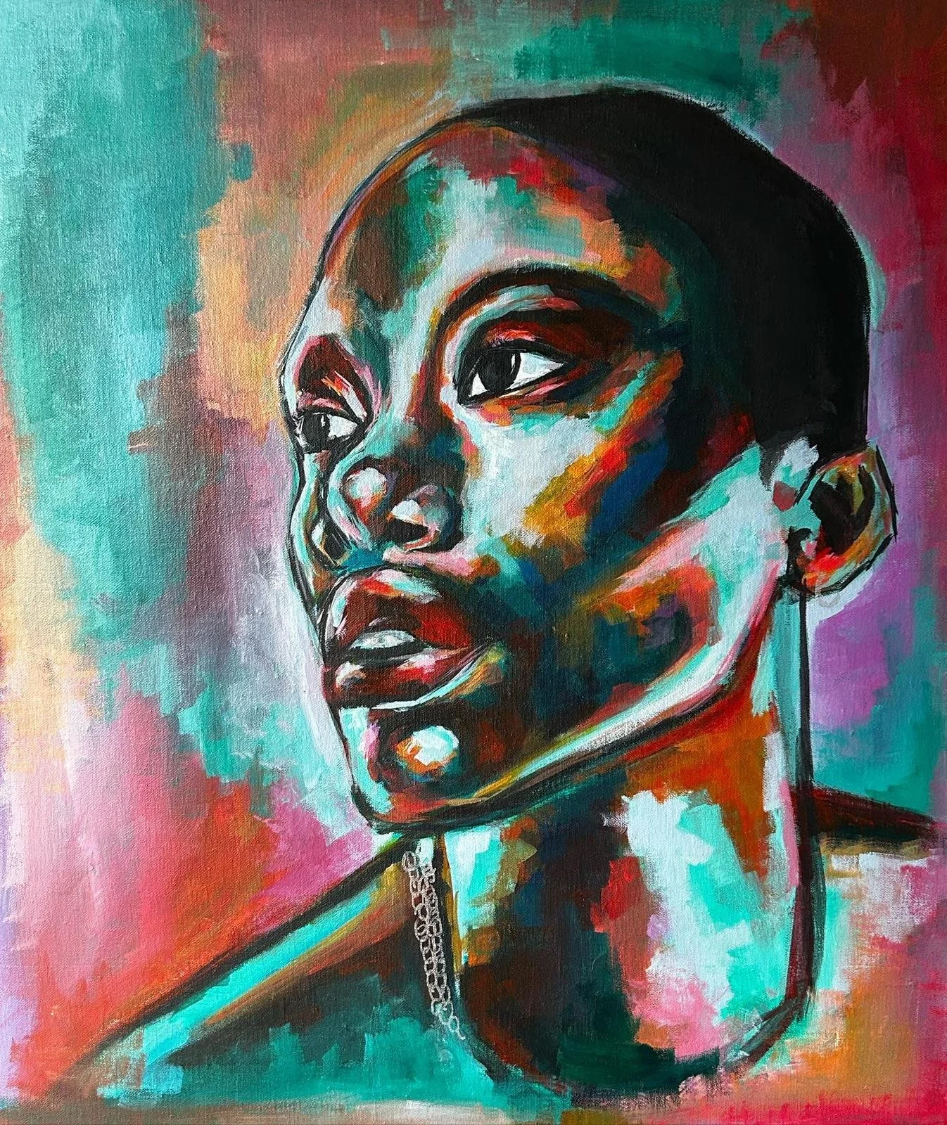 Megan Ward is a UK based Fine Arts Artist, with a Mixed Media Fine Art degree from the University of Westminster. Her study saw her pursue her desire to create pieces identifiable to her artistic style yet appealing to the masses. Having come from a background where art wasn’t the most accessible form of creativity, Megan found herself recreating what was around her, constantly capturing family members, magazine covers or whatever she could find. These experiences were what sparked her love for portraiture.
