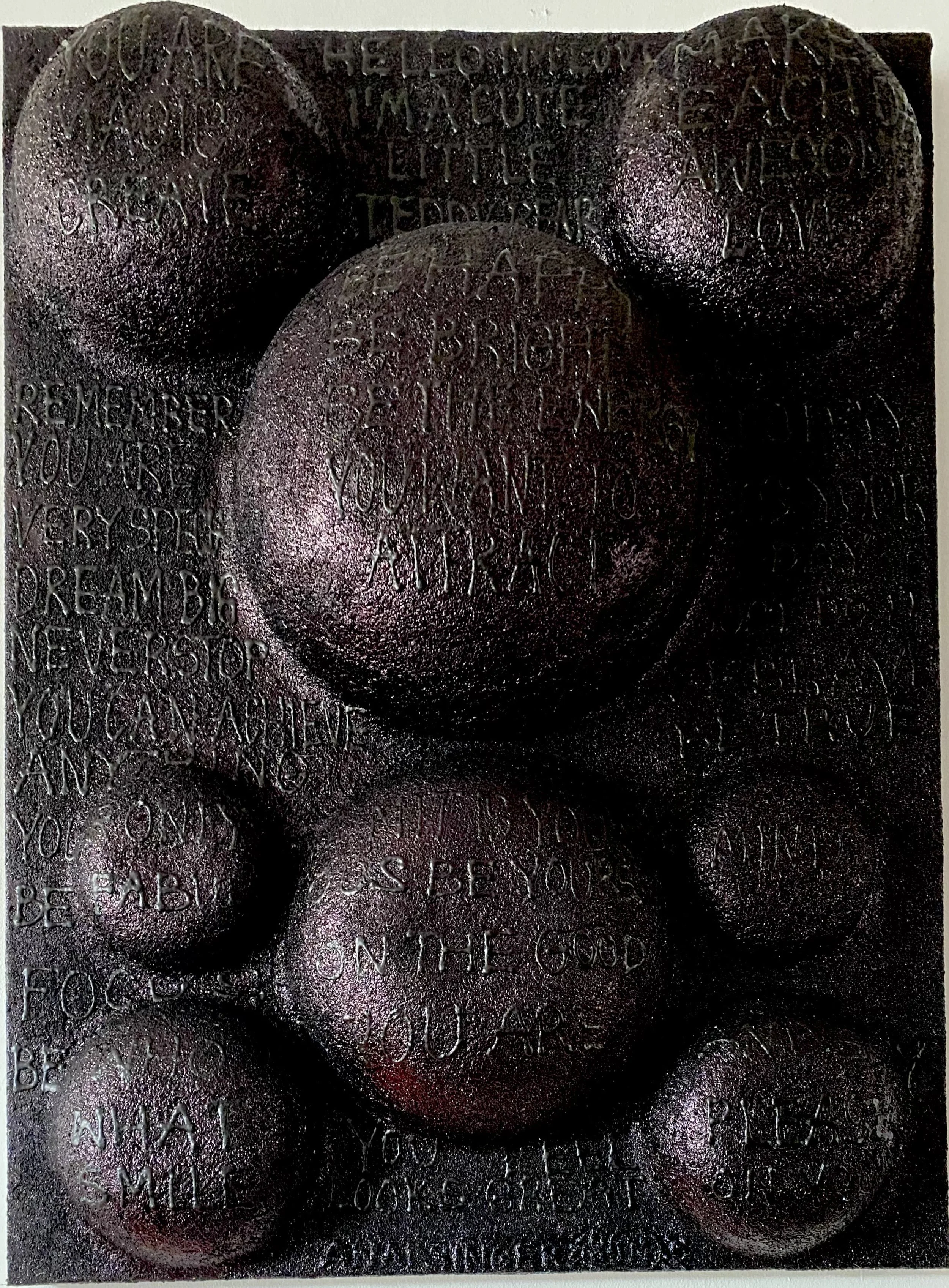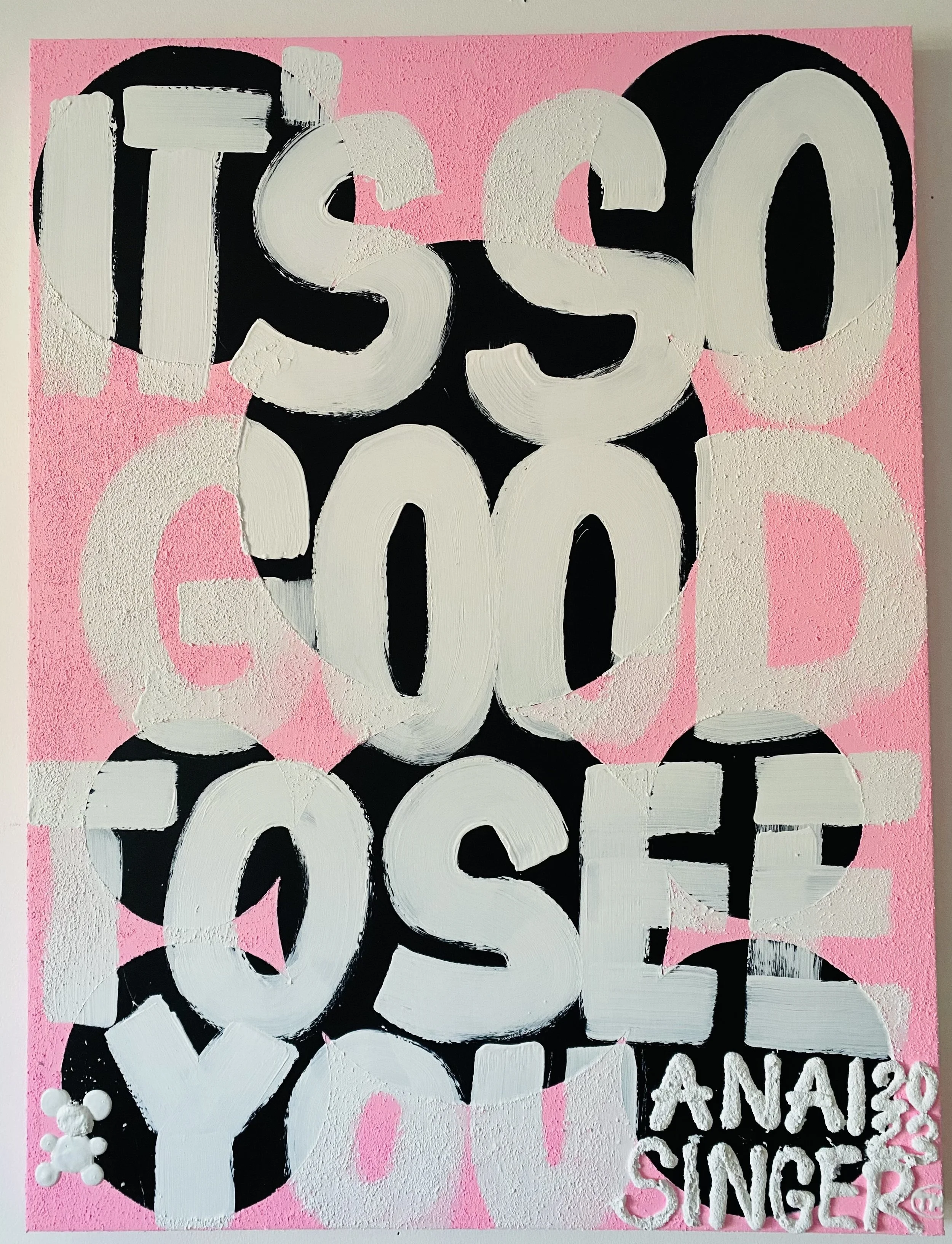Anai Singer's works perfectly finds itself in the 3d format . using textures and forms to express. Her latest collection of paintings entitled : “ teddy bears “ are a confirmation of her love for them. They fascinate the artist with both shape and cuteness. Typography is also something close to the artist’s heart. It allows for versatility in her creativity as it involves font style, appearance and structure, which aims to elicit certain emotions and convey specific messages . Paintings consisting of a letter composition are the Anai’s hallmark.